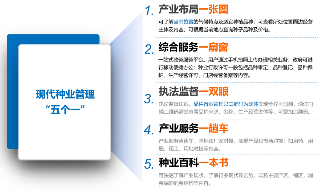 现代种业管理“五个一”理念立足种业全产业链数据资源整合,以“种业数据要素”为核心发展种业新质生产力,形成“用数据说话、用数据决策、用数据管理、用数据创新”的种业治理机制。实现从“数据采集->任务调度->服务响应->智能决策”的全流程闭环管理。推动制种产业从“经验驱动”向“数据驱动”跨越,让手机成为“新农具”,农户变成“新农人”,制种变成“新农活”。